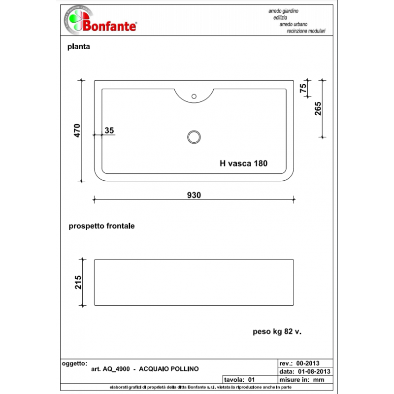 Acquaio Lavello Pollino da Muro Vasca Singola Bonfante AQ 4900 R / BAR