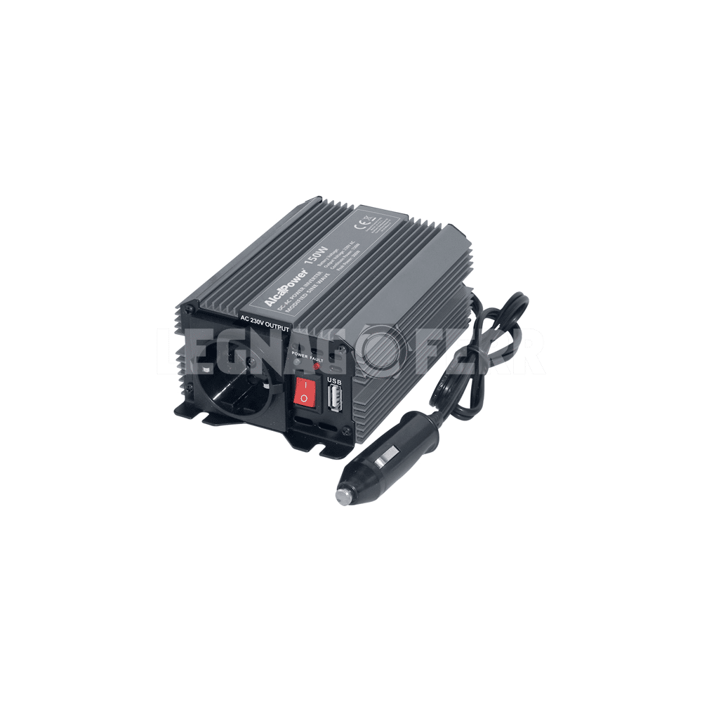 Offre una potenza continua di 150 W con picco di spunto fino a 300 W, adatta a carichi leggeri come lampade, caricabatterie e strumenti portatili. Il dispositivo è dotato di una presa Schuko 230 V e una porta USB 5 V DC 500 mA per la ricarica di smartphone o altri device.