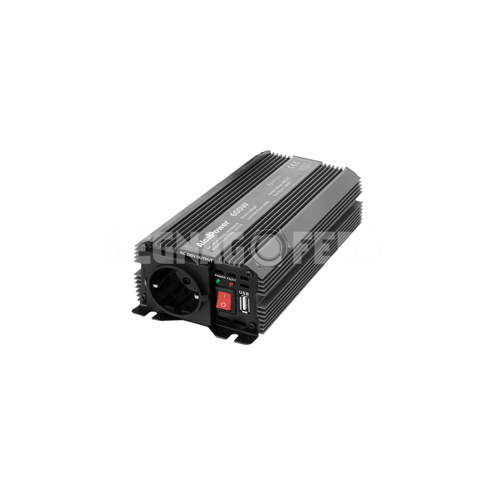L’Alcapower 912060 Inverter Soft Start 600 W 12 V DC → 230 V AC è un inverter DC-AC a onda modificata con soft start progettato per convertire la tensione 12 V DC di una batteria in corrente alternata 230 V AC a 50 Hz, permettendo di alimentare dispositivi elettrici in assenza di rete.