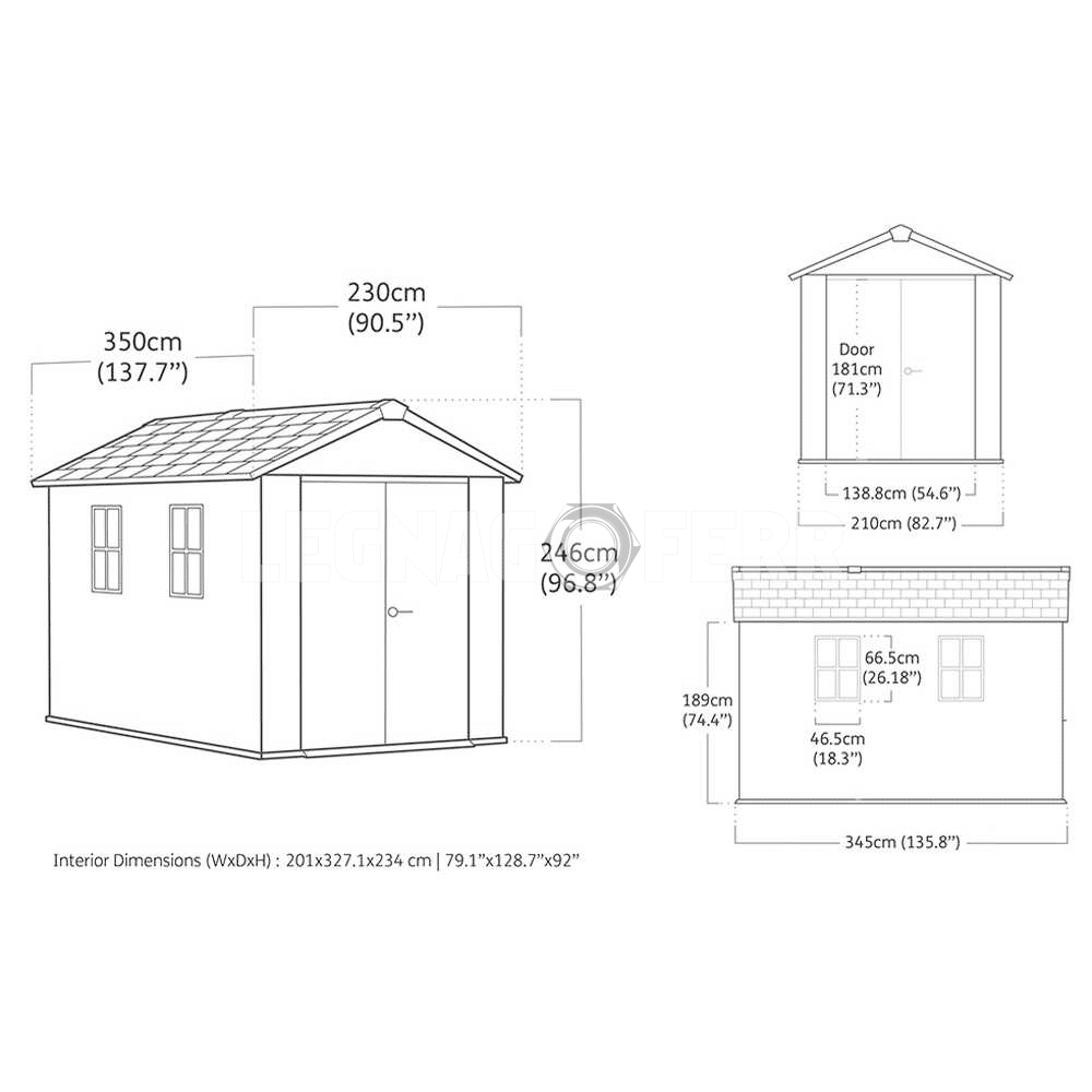 Con dimensioni di 230x350x246 cm, offre una superficie interna di circa 6,8 m² e un volume di 14,1 m³, rendendola perfetta per: