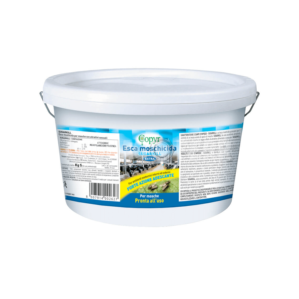 Il Sugarkill Extra 100 g di Copyr è un’esca insetticida granulare studiata per il controllo efficace delle mosche. Offre una combinazione di attrattivi alimentari e sessuali che loda la sua azione adescante: le mosche vengono attirate, si avvicinano all’esca e — grazie all’ingrediente attivo — muoiono per ingestione o contatto.