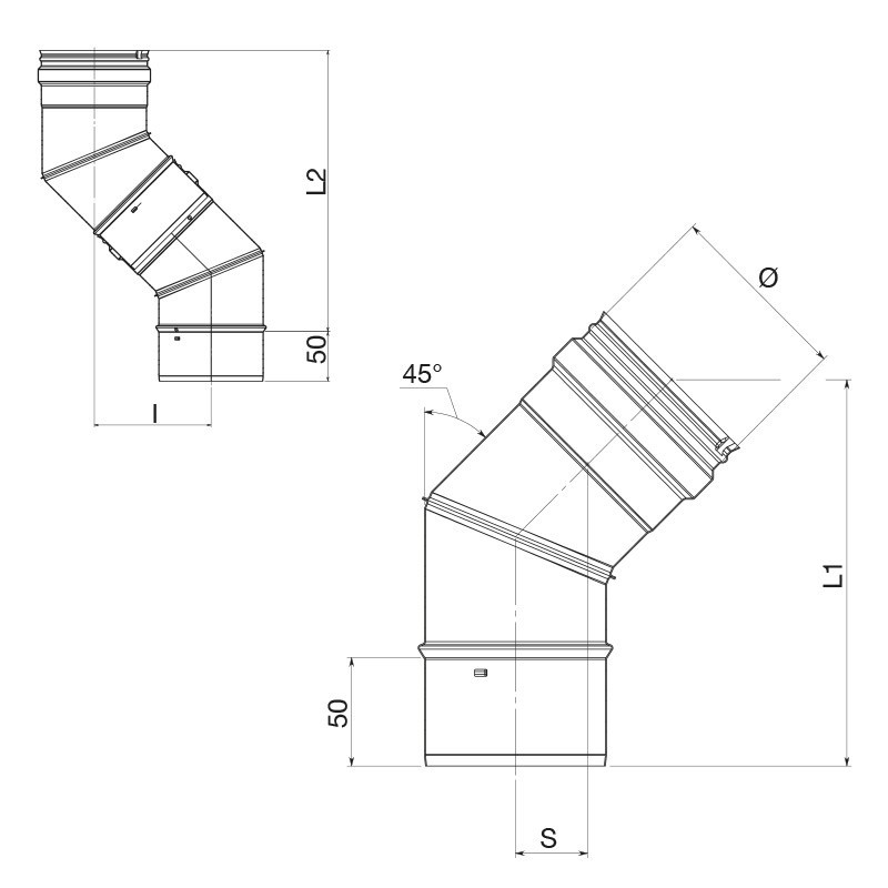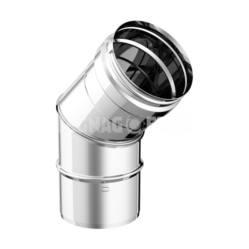 Curva a 45° Canali da fumo per uso interno in acciaio INOX spessore 0,5 mm. Tutti i prodotti sono realizzati mediante processi automatici quali: – saldatura laser longitudinale. – saldatura robotizzata al tig delle curve. – bicchieratura femmina con particolare sistema “click-clack“, esclusivamente dal diametro 80 al 200 compreso, che facilita e velocizza l’installazione . I canali da fumo per generatori a combustibile solido e/o liquido possono raggiungere una temperatura di esercizio fino 200°C massimo. Il Dynamic One viene utilizzato per l’evacuazione dei fumi in funzionamento a secco o a umido. E’ testato fino a 40 Pa in pressione negativa N1 (senza elastometro) e fino a 200 Pa in pressione positiva P1 (con elastometro). Adatti per l’intubamento o risanamento di cavedi e vani tecnici resistenti.  Tutta la linea è testata V2, quindi resistente alla corrosione e testata G, quindi resistente all’incendio di fuliggine a 1000°C.   Ulteriori articoli APROS al seguente link: https://www.legnagoferr.it/categoria-prodotto/riscaldamento/fumisteria/