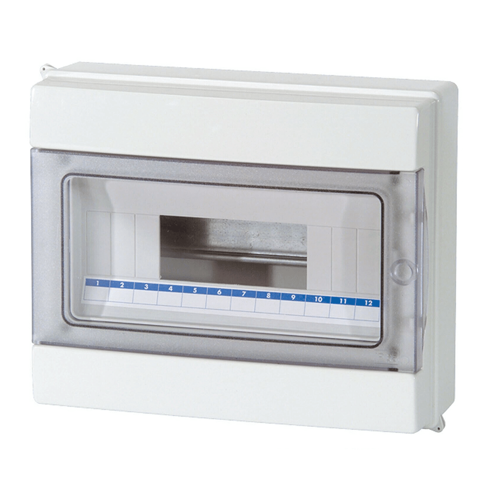 Centralino da parete FAEG FG14512 per 12 moduli DIN, con grado di protezione IP65 e portello fumè, ideale per impianti elettrici civili e industriali.