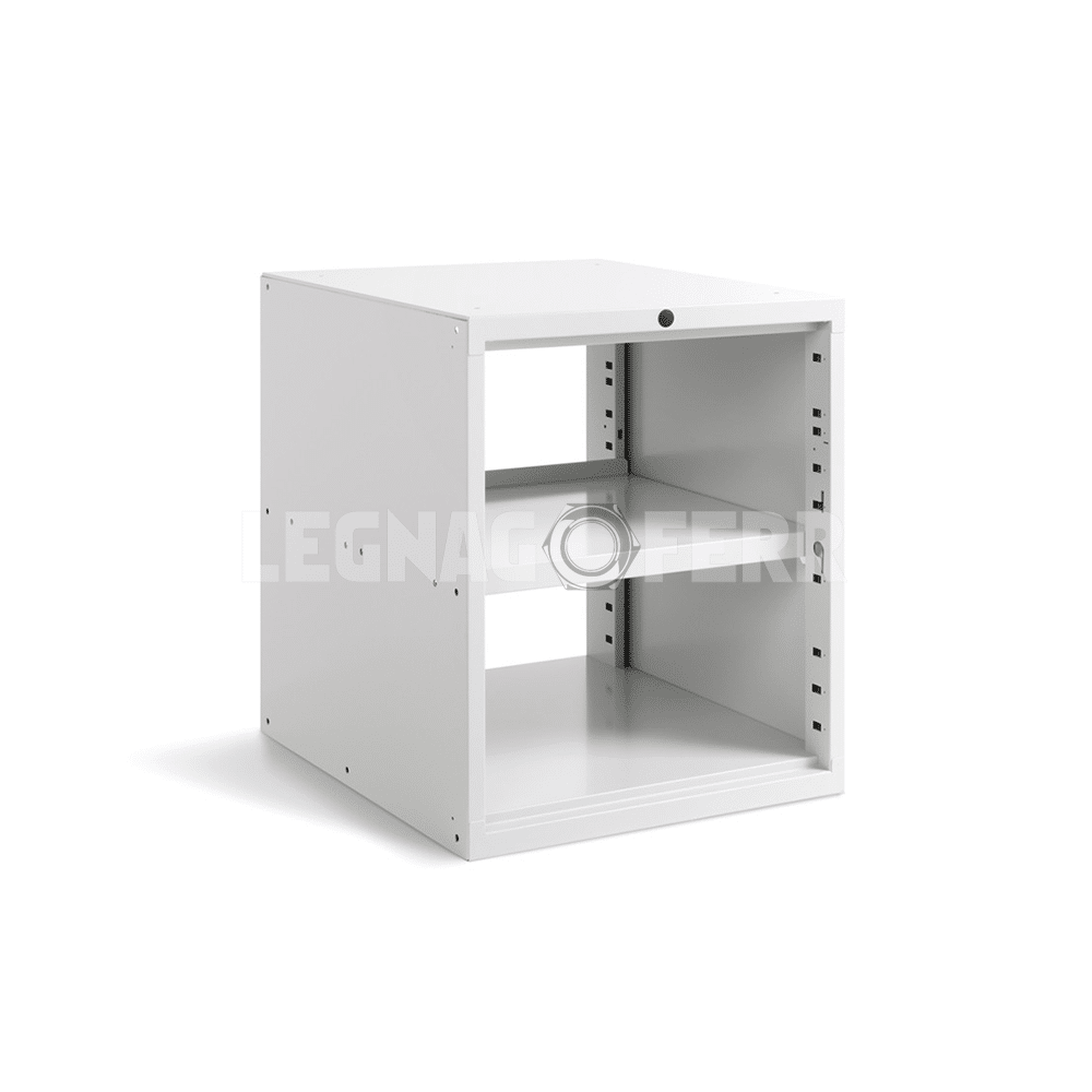 La parte inferiore del banco da lavoro portautensili può essere allestita con un armadio che presenta un piano intermedio che crea due vani per l’organizzazione di componenti ed attrezzatura. L’armadio può essere utilizzato aperto oppure può essere chiuso tramite porte totali con chiusura a cilindro ed apertura a destra o a sinistra.