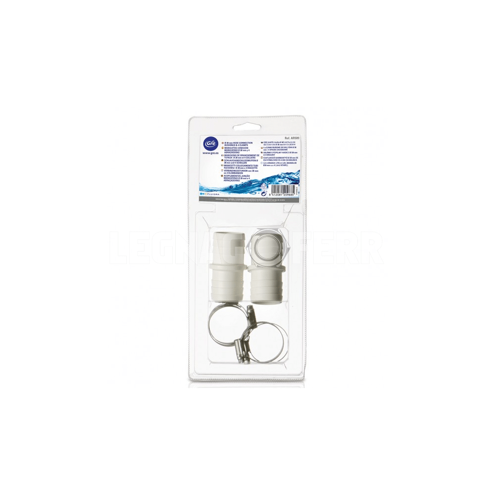 Kit connettori GRE AR509 per tubi piscina Ø38 mm. Include 2 raccordi e 4 fascette inox per collegamenti sicuri e senza perdite.