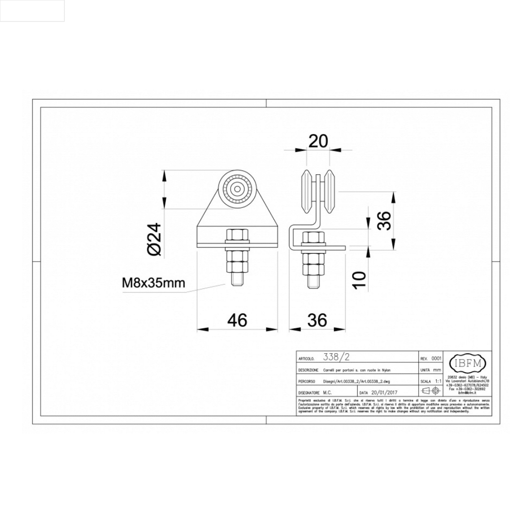 Il carrello IBFM Art. 338/2 è un componente semplice e funzionale, realizzato in lamiera stampata zincata, adatto per portoni scorrevoli leggeri o di dimensioni contenute. Le sue 2 ruote su cuscinetti a sfera garantiscono uno scorrimento fluido e regolare su guide compatibili.