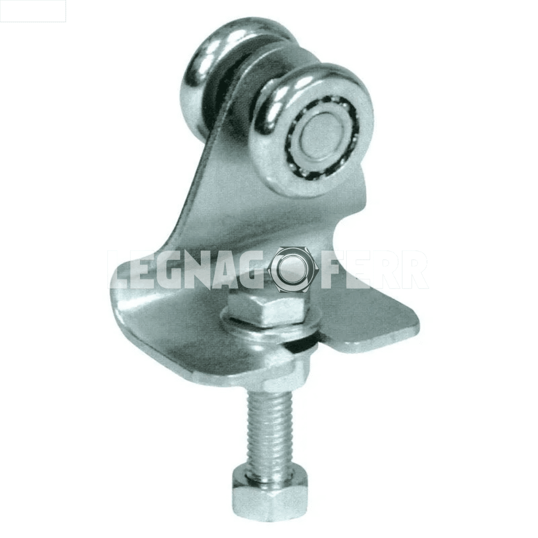 Carrello in lamiera zincata con 2 ruote su cuscinetti, ideale per portoni scorrevoli leggeri. Compatto, resistente e facile da installare.