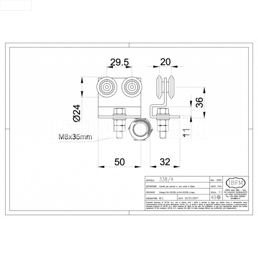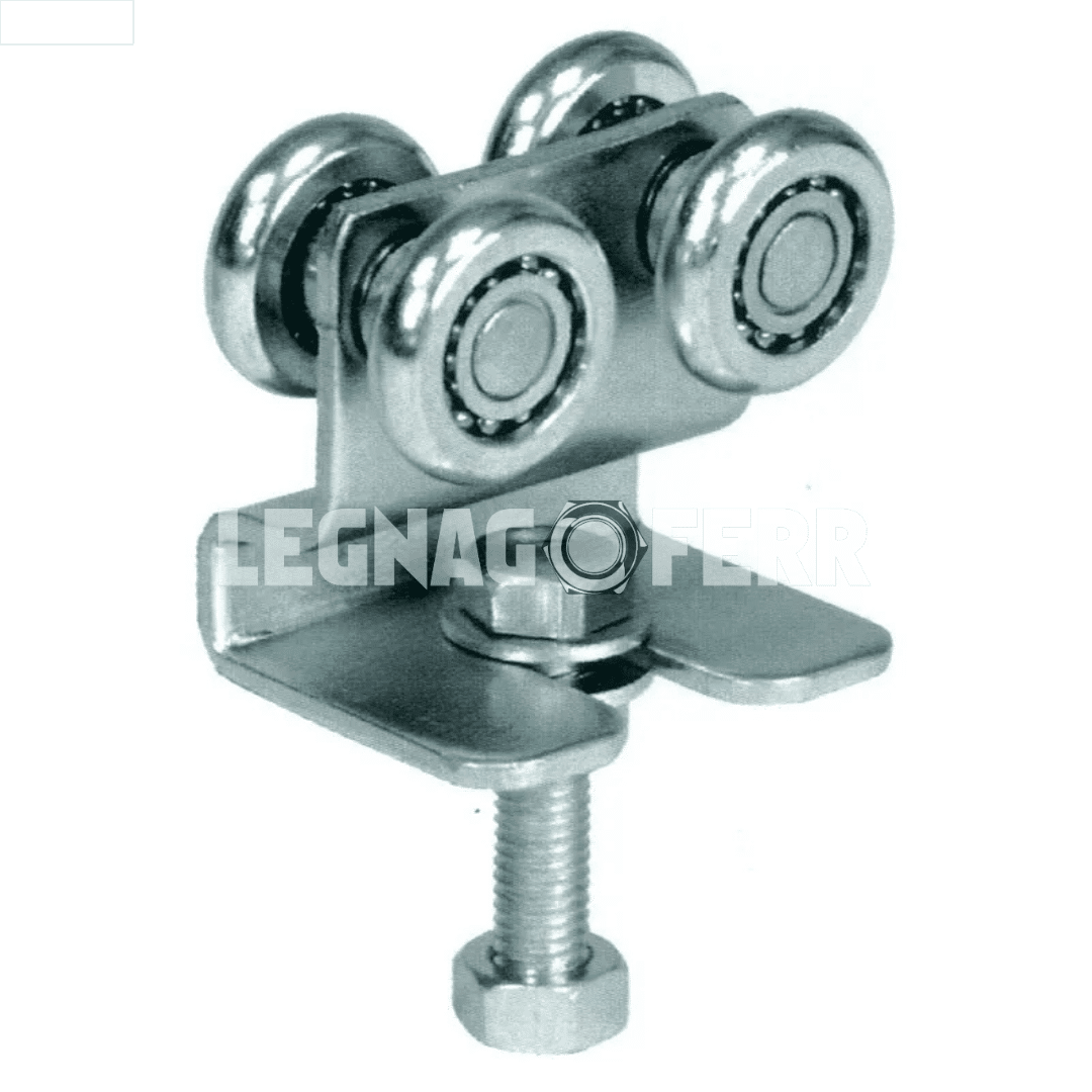 Il carrello IBFM Art. 338/4 è realizzato in lamiera stampata zincata ed è dotato di 4 ruote con cuscinetti a sfera, che garantiscono un movimento fluido e silenzioso anche su portoni di media grandezza. La doppia coppia di ruote consente una migliore distribuzione del carico e una maggiore stabilità durante lo scorrimento.