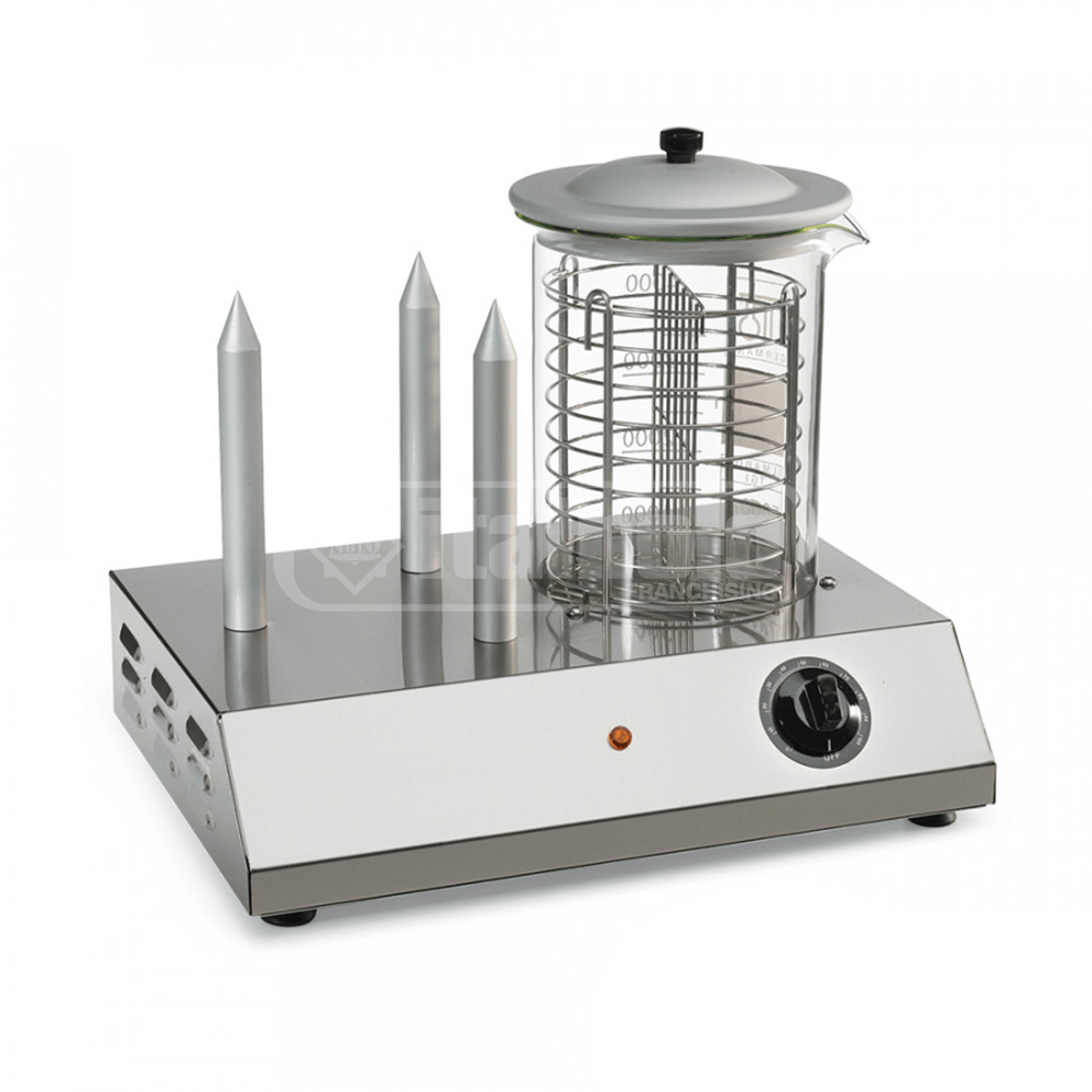 Per confezionare deliziosi sandwich (hot dog). Blocco in acciaio INOX con punte per il pane e contenitore termico per wurstel.