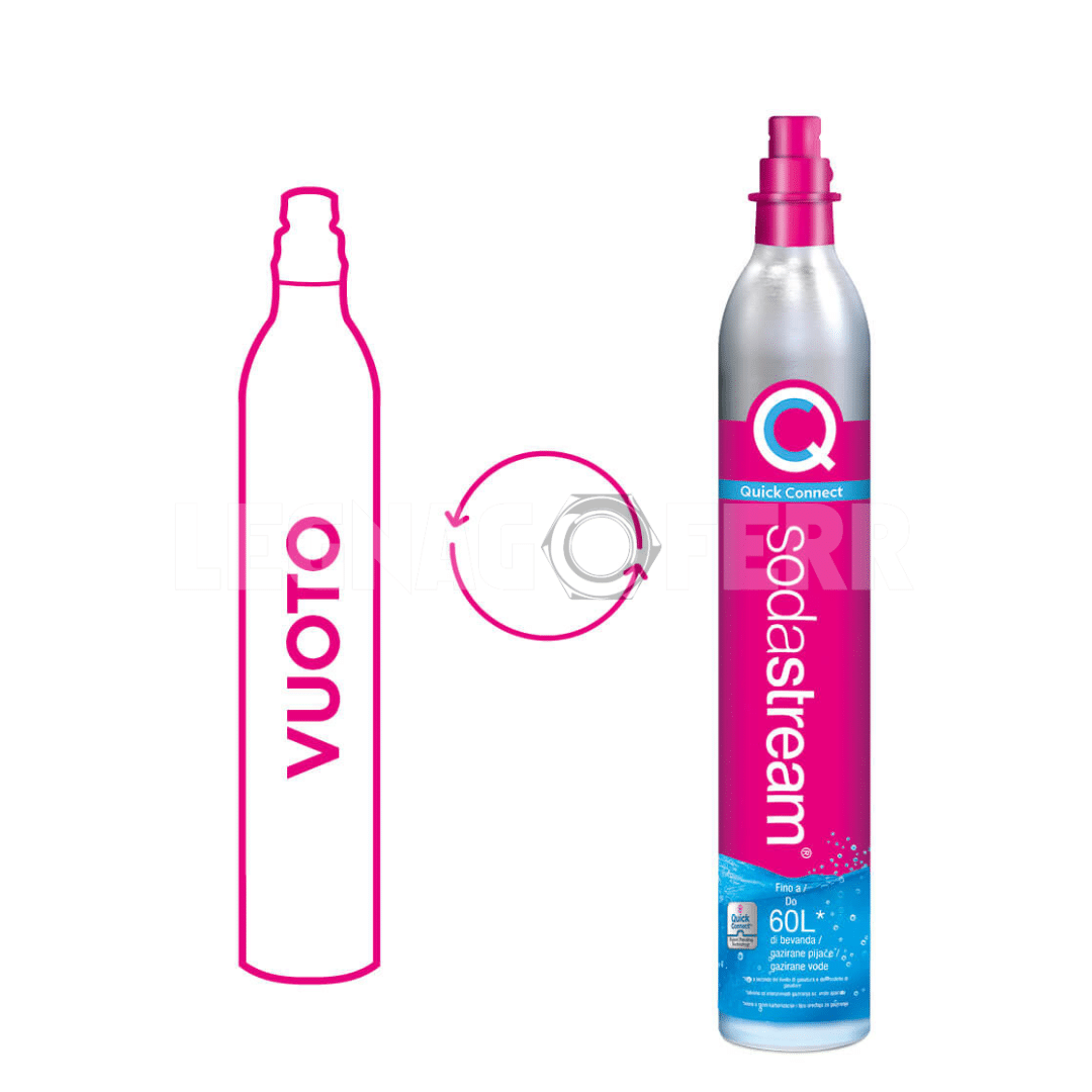 Ricarica Co2 per gasatore ad incastro Sodastream acquistabile solo in negozio a 12,90€ con restituzione del vuoto, altrimenti a 34,90€ senza restituire il vuoto.