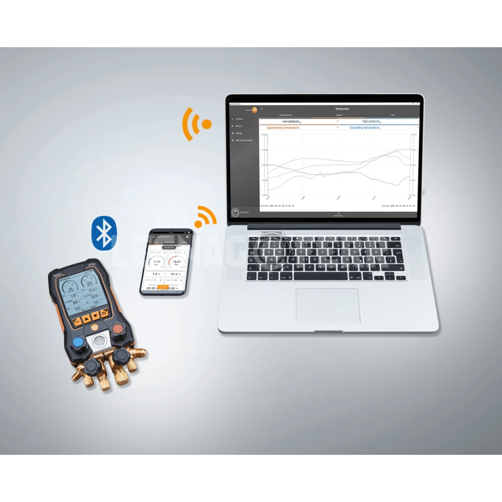 Inizia subito le tue misure wireless su impianti a circuito frigorifero. Il pratico kit contenente il manifold digitale testo 570s con Bluetooth e blocco valvole a 4 vie insieme alle sonde termometriche e per il vuoto wireless più tubi di riempimento è ideale per misure standard e nel lungo periodo.