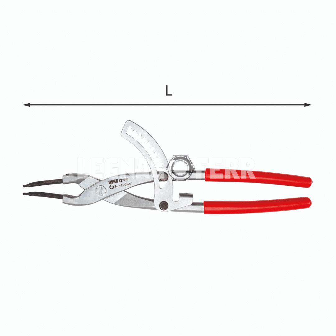 La USAG 127 MP è una pinza professionale con becchi piegati a 45° per un migliore accesso agli anelli elastici interni di grandi dimensioni. Il sistema a cremagliera garantisce una presa stabile e sicura, riducendo lo sforzo dell’operatore e migliorando la precisione dell’intervento.