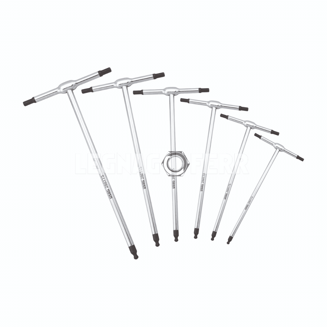 - Chiavi a T con maschio esagonale e testa sferica nelle misure: