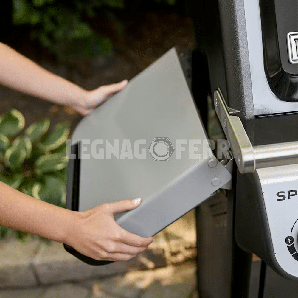 Il barbecue è pensato per la praticità quotidiana: i ripiani laterali pieghevoli permettono di risparmiare spazio, mentre i ganci porta utensili e l’armadietto con sportello consentono di mantenere tutto in ordine. Il sistema di raccolta grassi removibile facilita la pulizia e migliora la sicurezza durante l’utilizzo.
